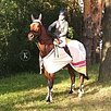 С рождения находится в одних руках. Честный, аккуратный. Стартовый опыт до 130 см включительно, одиночные до 145 см. Знает многие выездковые элементы: принимания, уступки, пируэты. Подойдет под начинающего всадника, ребенка, невысокого любителя. На данный момент прыгает под ребенком на соревнованиях до 90 см, дома до 105 см. Имеет опыт выездных соревнований.