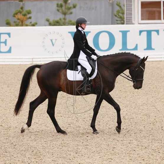 • Прекрасный экстерьер, все рычаги на месте. Активный зад, хорошая работа суставов, заступ 2-3 копыта, ровный по голове, работается КМС, иногда ездит совсем слабый любитель.