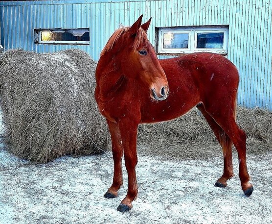 Очень добронравный и смелый. Выращен на хороший кормах, ежедневно получает все необходимые подкормки для молодой лошади. Правильно сложен по экстерьеру, обладает хорошими движениями.