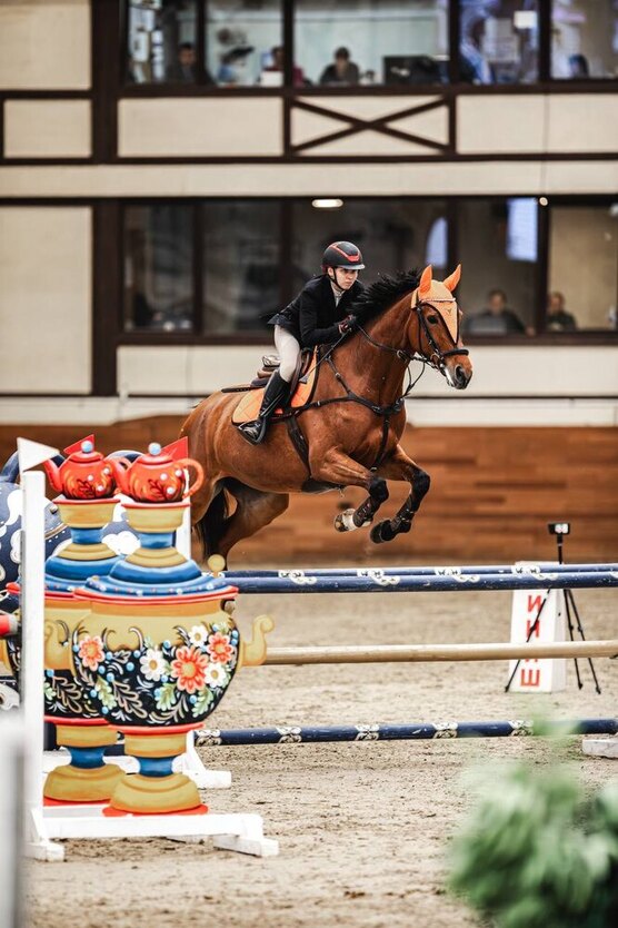 Десять последних стартов - девять чистых маршрутов + выиграла конкурный биатлон. Очень сильная кобыла в большой спорт. Её родной брат выиграл Чемпионат России по группе А в маршруте с высотой препятствий до 160 см.