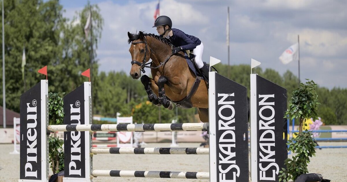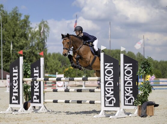 Напрыган до 150 см в шпринте, на тренировках до 130, маршруты на турнирах до 120, поедет выше при грамотной работе. На хороших движениях. На барьеры не смотрит.