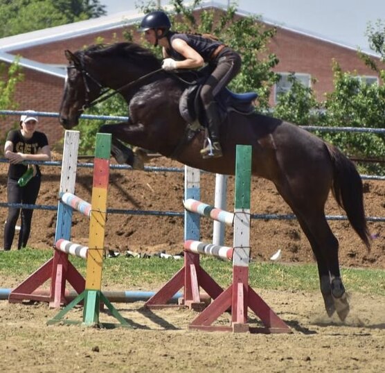 Старты - маршруты до 100 см. Дома - связки до 110 см, одиночные до 120 см, шпринт до 130 см (выше не ставили). Знает одиночные менки, уступки и принимания. Последний год работает под слабыми всадниками в группе. Ничего не боится, безопасна в руках, можно доверить начинающему. Отлично ведет себя на новых площадках.