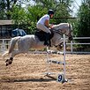 Прыгает до 120. Уверенно ид?т на любой барьер, не обносит, не закидывается. На высоту не смотрит, прыгает из любых положений. Есть стартовый опыт, часто в призах. На выездных соревнованиях, как дома.