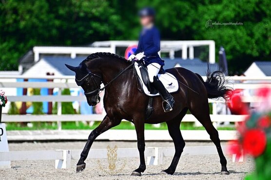 Очень элегантная лошадь с красивой головой, на правильных движениях.