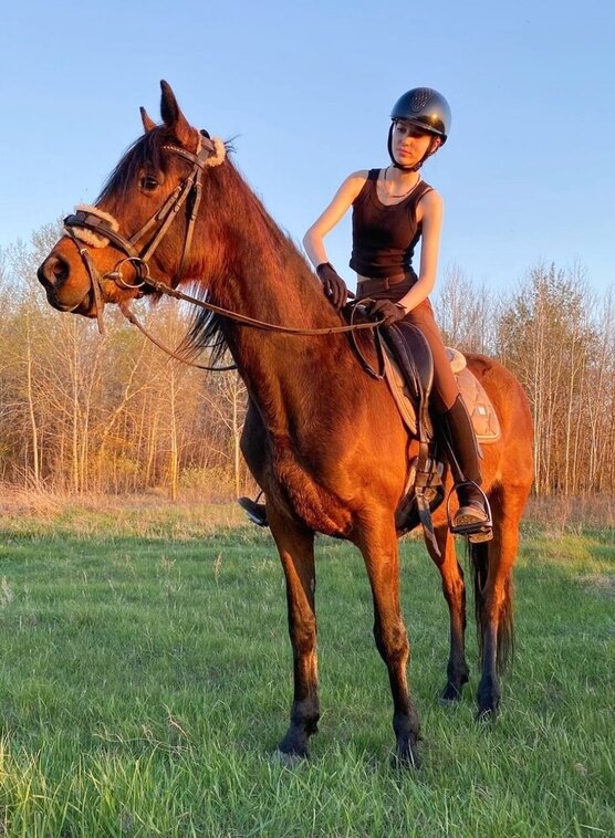 Кобыла хобби класса. Очень мягкая по аллюрам - можно пить чай. Ездят дети, колется, раньше ходила в прокате, сейчас гуляет в поле и редко подсаживаются верхом. Работает как на плацу, так и в поле. Любит купаться, хорошо смотрится на фотосессиях, отлично табунится с другими лошадьми. Немного напрыгана, имеет хорошую технику прыжка, жеребилась.