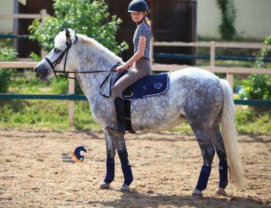 Обладает мягчайшими аллюрами и бронебойной психикой. Работает в пони-клубе - катает малышей, прыгает маршрутики до 70 см., бегает Детские езды, используется в иппотерапии.