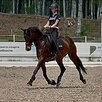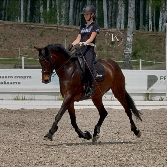 Смелая, стабильная, адекватная, ничего не боится, имеет идеальную психику. Уровень подготовки: юношеские езды. Прыгает небольшие барьеры под верхом и шпринт. Подойдет под любого всадника. Ходит в лес и поля.