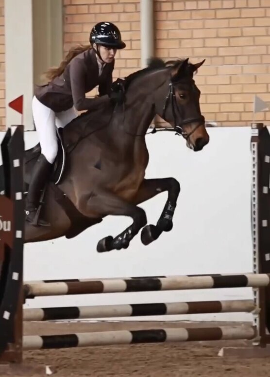 Стартовый опыт до 100 см, связки до 120 см, в шпринте до 140 см. Прыгает любые заборы и канавы, ни на что не смотрит. Удобная на всех аллюрах. Все манипуляции без проблем.