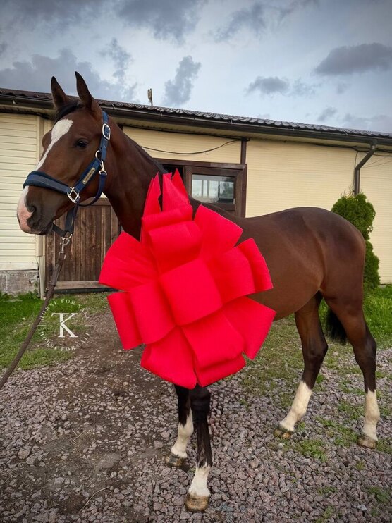 Жеребец. Голландской теплокровной породы. 165 см в холке. 2024 года рождения. Мать - прыгала маршруты до 140 см, выиграла этап кубка мира, сестра матери - бегала СП, отец - молодой талантливый жеребец.