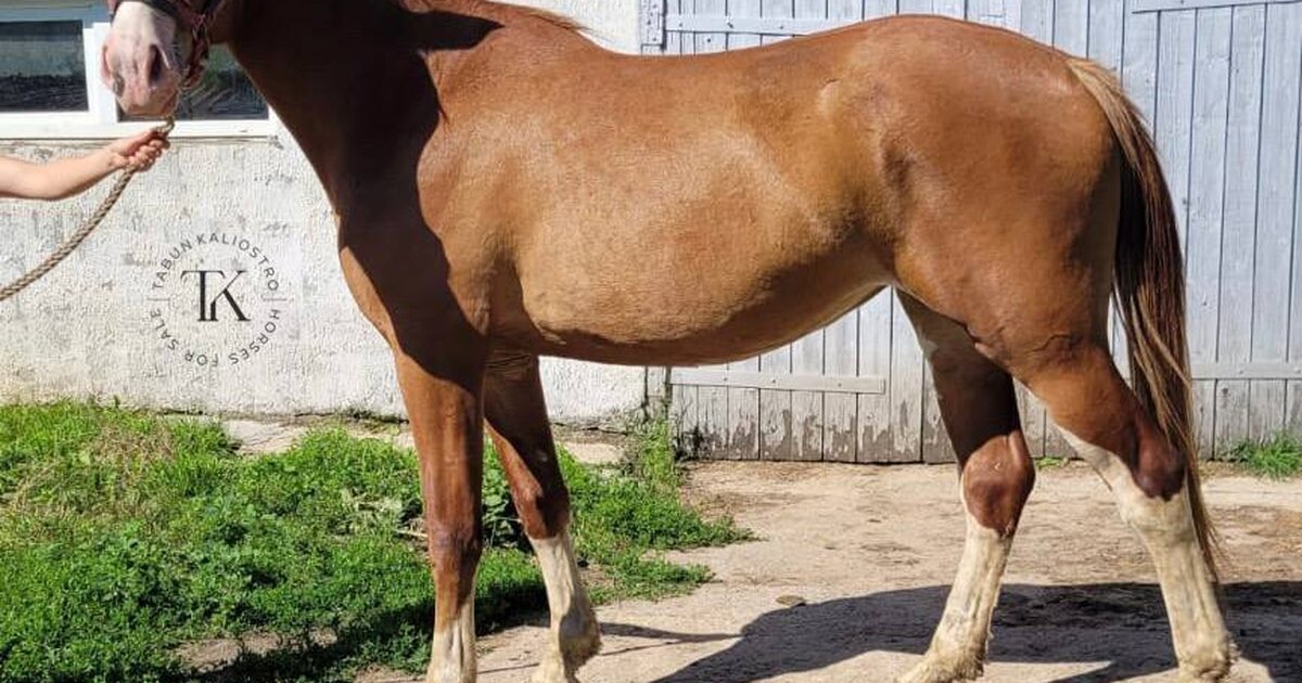 Кобыла. Тракененской помеси. Рыжей масти. 162 см в холке. 2021 года рождения. Отец - Панхарт.
