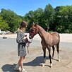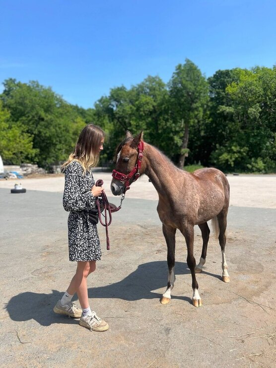Ходит на недоуздке, чистится, контактна к человеку.