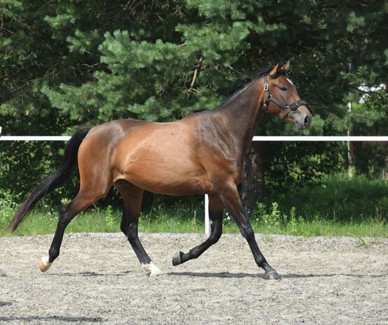 Заезжена. Очень перспективна в троеборное направление. Шпринт 130 см, под верхом 60 см прыгает легко. Знакома с водой, идет с галопа как к себе домой.