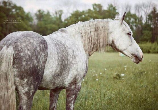 Кобыла хобби класса. Подойд?т в учебную группу, прокат, фотосессии или для души. Работала под детьми и взрослыми, катала прогулки, участвовала в фотосессиях, свадьбах и иппотерапии. Немного напрыгана, но под уверенного всадника. Бегала детские езды, корда на 5+ от голоса. С другими лошадьми характерна, в леваде гуляет одна, под верхом вед?т себя адекватно, если держать дистанцию, в смене ходит последняя. Сейчас гуляет в поле, нужно ввести в работу.