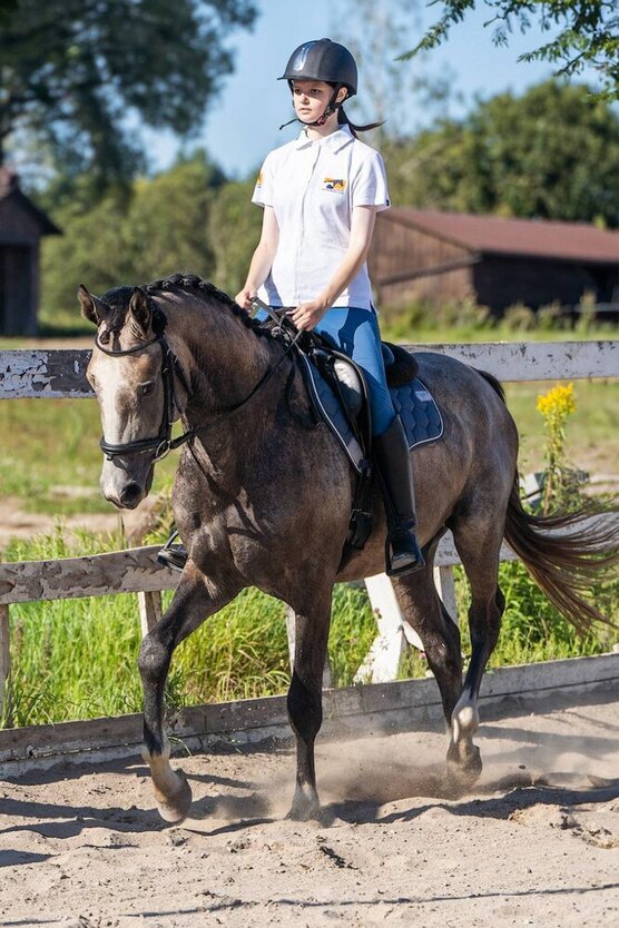 До середины августа жил со сверстниками в леваде, социализирован. Сейчас содержится в деннике и гуляет в отдельной леваде. Напрыган в шпрингартене до 140 см. Под всадником до 90 см. Отличная техника прыжка. Очень приятный под седлом: мягкий, удобный. Лошадь на движениях, двигается от зада, работает спиной.