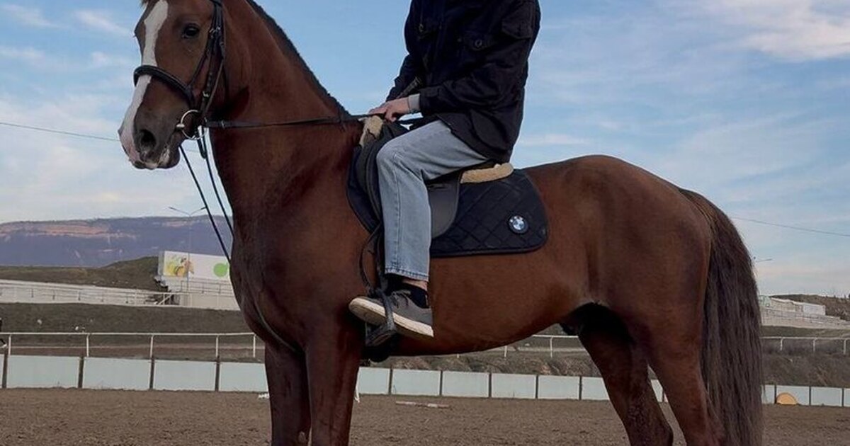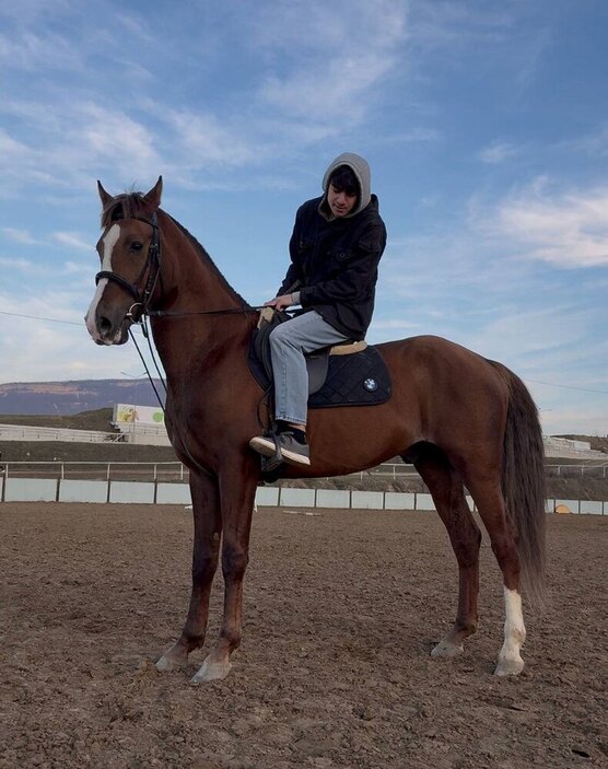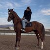 Поздней заездки, начинает втягиваться в конкурный тренинг - работает по жердям, крестики, связки 60-70 см.