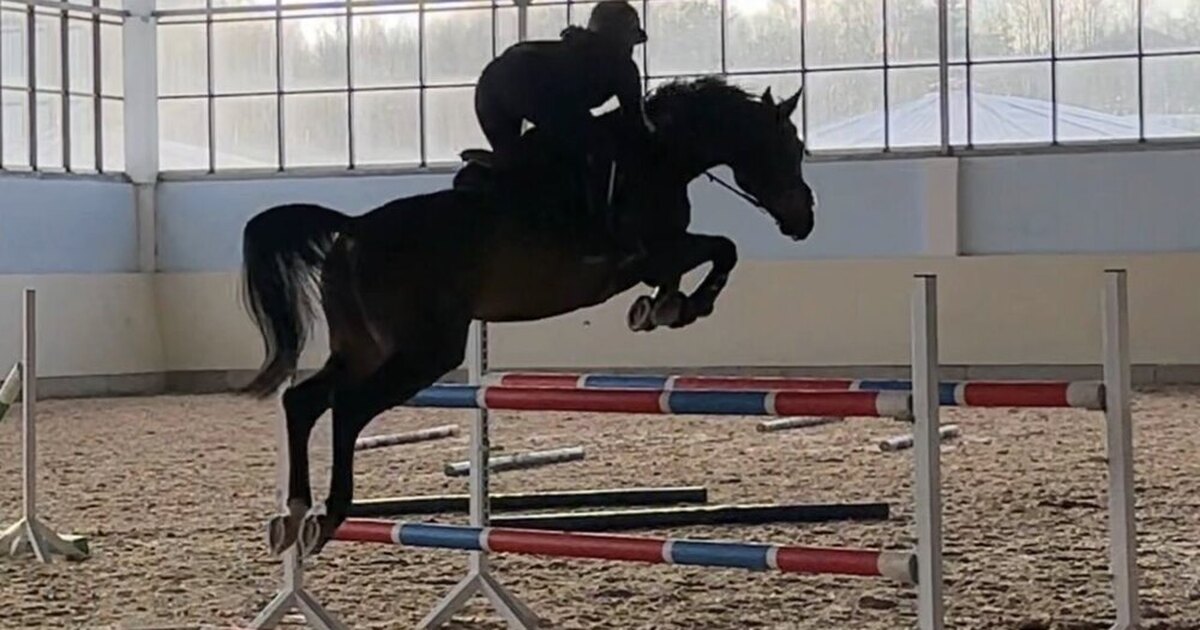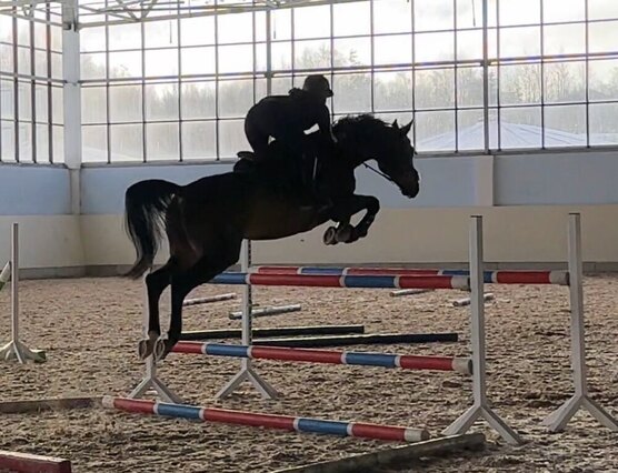 Выступал маршруты до 115 см под ребёнком, дома прыгает до 125 см, пробовал кроссовые барьеры.