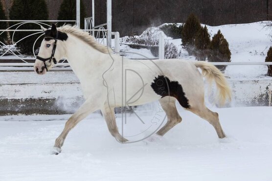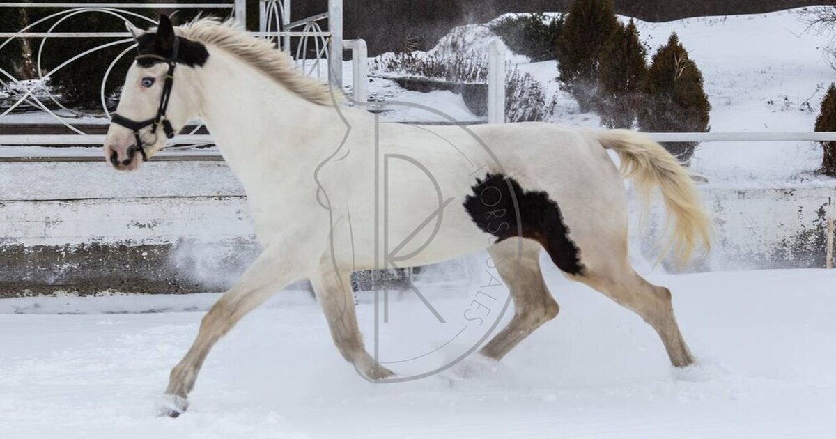 • Полукровная кобыла, нарядной пегой масти с нереальными голубыми глазами.