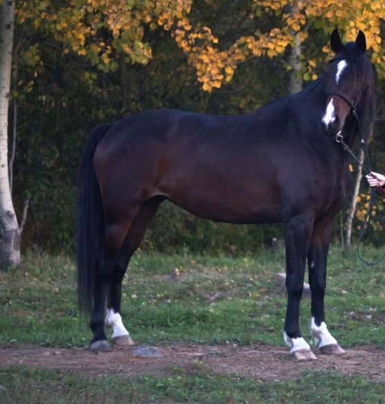 Кобыла заезжена в 7 лет, три аллюра, небольшие крестики, кавалетти. В данный момент вводится в работу, так как в том году жеребилась и была снята с работы. Бегает на корде, колется, чистится, стоит на развязках. На корде ездили дети с 10 лет.