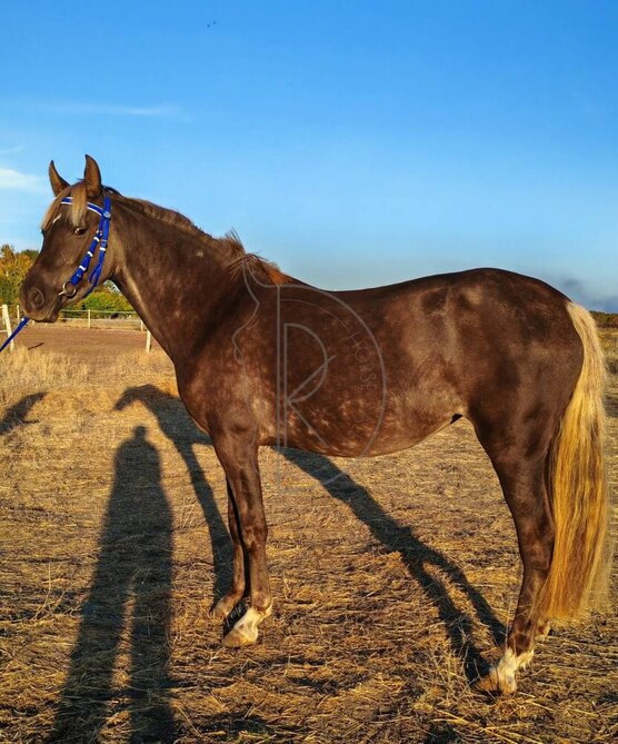 • Молодая лошадь, помесь пород. Пока не заезжена, оповожена, работает на корде, приручена ко всем манипуляциям (чистка, расчистка, мойка). Добрая и ласковая девочка без вредных привычек. Имеет лёгкие, просторные движения, не пугливая, быстро всему учится.