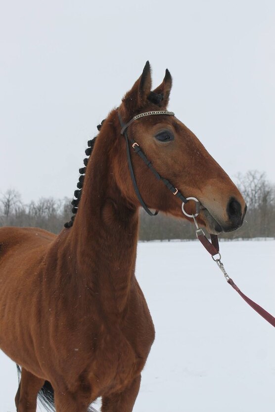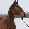 Прошла заездку, очень мягкая под седлом на 3х аллюрах, ходит в поля, работает на плацу. Напрыгана в шпринте 110 см.
