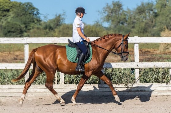 Заезжен весной 2025 г. Проходит базовую подготовку под седлом. В шпрингартене напрыган до 140 см. Работается согласно возрасту, не форсируем.