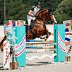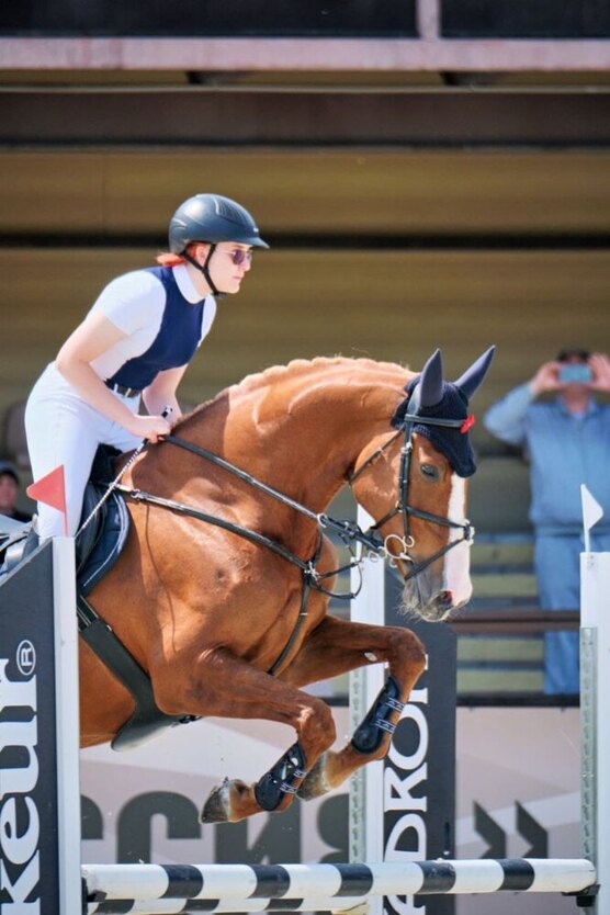 Несмотря на размеры, хорошо проходит короткие повороты, шустрая. Прыгает все виды барьеров. Техничный прыжок. Хорошо меняет ноги, знает принимания и уступки.