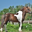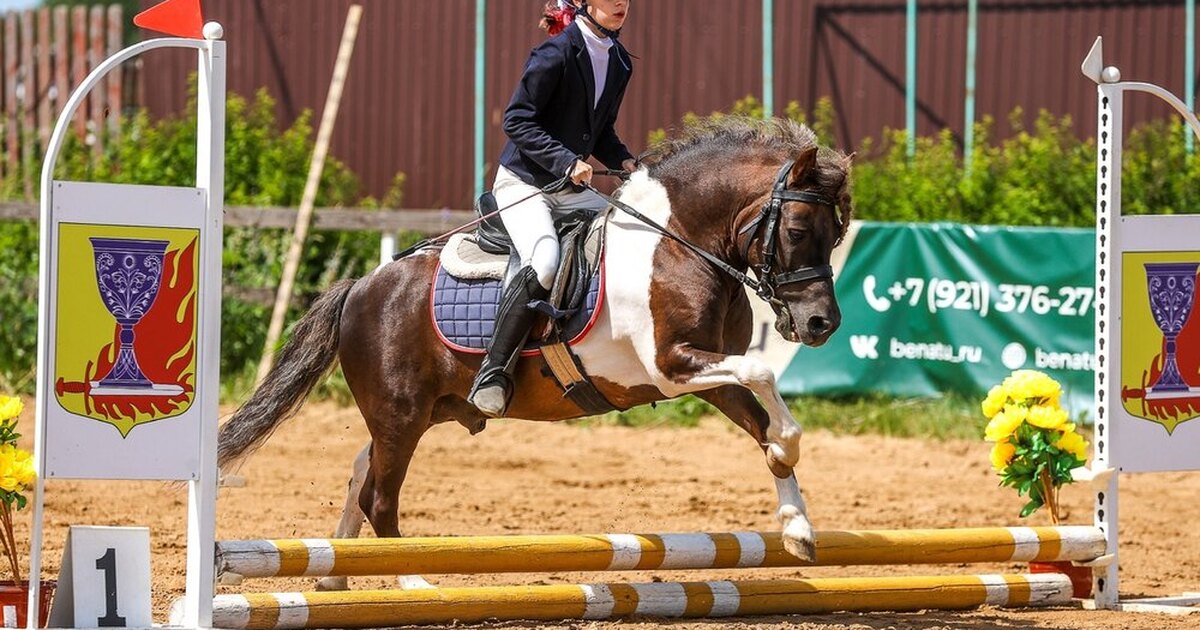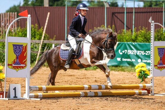 Шетлендский пони Ленгер (Еремей-Летиция), 109 см в холке, рыже-пегой масти, обладает широкими плавными движениями, аккуратной маленькой головкой с прогнутым профилем, ровный корпус, широкий постав конечностей. Абсолютный Чемпион выставки Иппосфера 2017 и 2025 года среди всех пород пони.