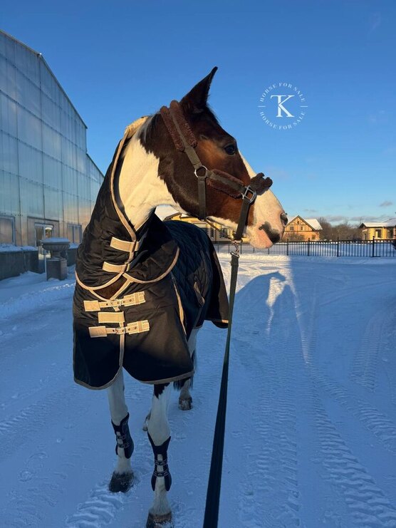 Кобыла. Голландской теплокровной породы. Пегой масти. 172 см в холке. 2014 года рождения. Импортирована из Германии в августе 2025 года, рождена в Голландии.
