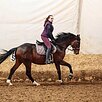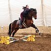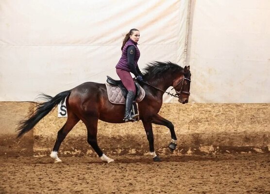 Старты - езды для 4-летних лошадей. Дома - шпринт до 120 см. Адекватный, старательный, внимательный, охотно учится новому. Хорошо управляется, спокойно работает с другими лошадьми в манеже. Победитель Иппосферы 2025 в ринге тракененской породы. На данный момент работается в выездковом направлении.