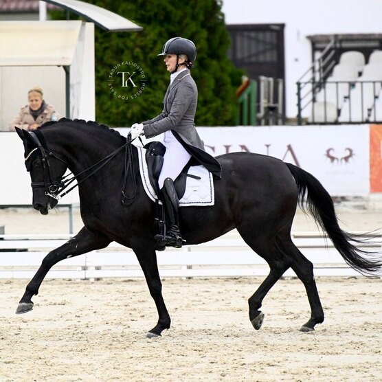 Кобыла. Голландской теплокровной породы. Вороной масти. 168 см в холке. 2015 года рождения. Отец - Гламурдей, Мать - Эфира. Рождена в Нидерландах.