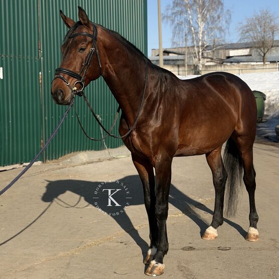 Отец - Вайдевуд, мать - Вихора. Имеет отличный характер, очень спокойный. Уровень подготовки: езды по 5 - летним лошадям на 76%, готовится на юношеские езды, учится выполнять менки, пробовали делать темповые менки, ответил с первого раза, без каких-либо проблем. Подойдет даже под ребенка. Имеет комфортные аллюры, очень удобный, легко держит контакт. Имеет отличную психику, ничего не боится. Не реагирует на других лошадей. Не имеет денниковых пороков, без проблем пшикается и колется.