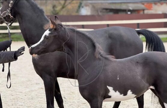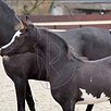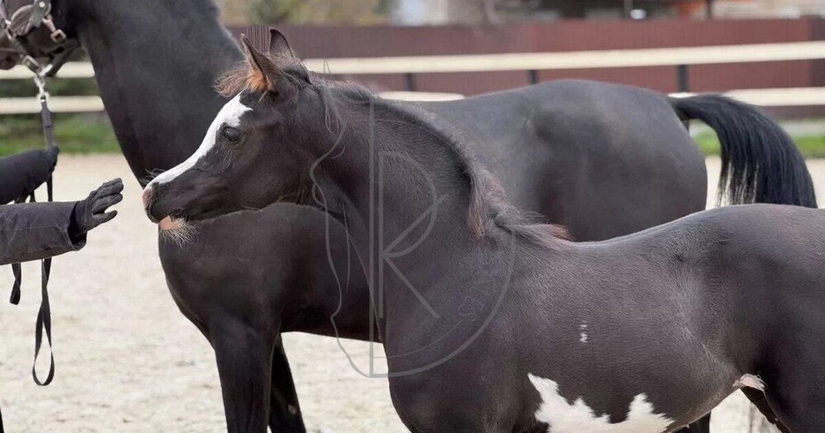 • Очень редкая масть - вороная-сабино, практически не встречается в России. Мама вороная, отец вороной-сабино. Оба стоят в ВНИИК, происхождение полное и подтверждённое.