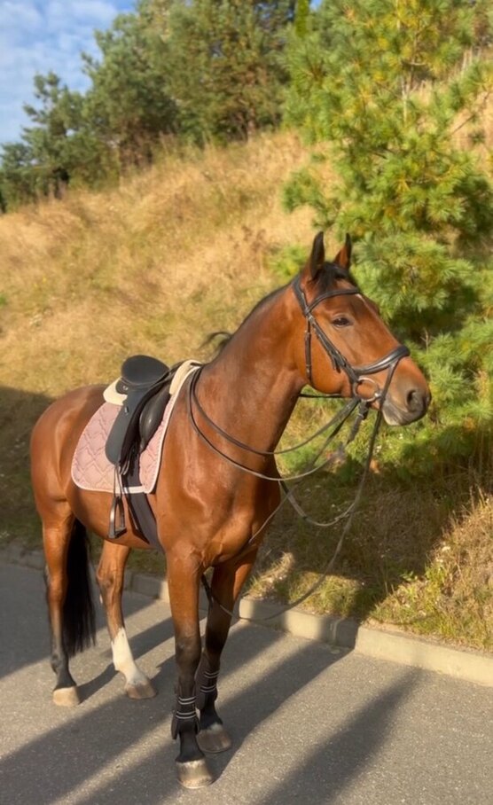 Подойдет под начинающего при наличии берейтора который будет подрабатывать раз в неделю ,в турнирах не участвовал,знает боковые ,прыгает до 80 см