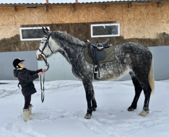 Поздней заездки. Дома - одиночные до 60 см; учит уступки. Очень мягкая на средства управления. Добрая, безопасная - ездят дети на корде. Жеребилась, дает рослых жеребят. Стабунена.