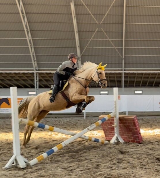 Кобыла заезжена, имеет минимальные базовые навыки в выездке: уступки, плечи, переходы, подъемы. Под седлом напрыгана до 100 см.